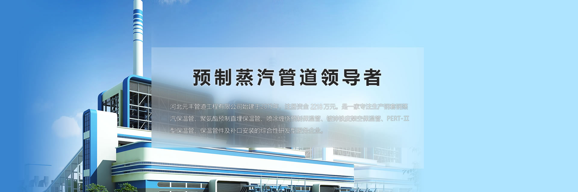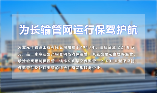河北元豐管道工程有限公司始建于2013年,注冊資金2218萬元。是一家專注生產鋼套鋼蒸汽保溫管、聚氨酯預制直埋保溫管、噴涂纏繞預制保溫管、鍍鋅鐵皮架空保溫管、PERT-Ⅱ型保溫管、保溫管件及補口安裝的綜合性研發(fā)型服務企業(yè)。